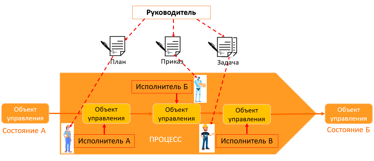 Теоретически управление бизнес-процессами (BPM) давно стало общепринятым и понятным подходом, однако может ли руководитель управлять бизнес-процессом и что это значит на практике? Как объект управления бизнес-процесс, на самом деле, не существует – это слишком абстрактная сущность для того, чтобы им реально оперативно управлять. В действительности руководитель оказывает управляющее воздействие на конкретных исполнителей: сотрудников; автоматизированные производственные системы, включая программных и физических роботов, системы ИИ. Как видно из рис. 1, объект управления в состоянии А преобразуется в состояние Б путем выполнения последовательных воздействий, которые оказывают на него исполнители. Объектом управления может быть материальный ресурс или информация (документ).