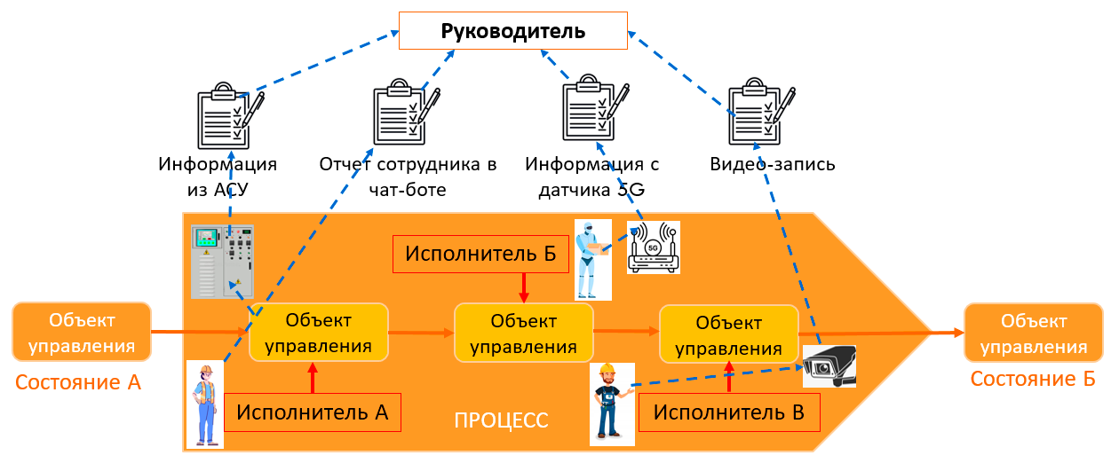Руководитель управляет исполнителями посредством системы планов, приказов, устных и/или письменных распоряжений, постановки задачи (например, в Task tracker или чат-боте). Для реального управления нужны обратные связи, необходимые для выявления отклонений и формирования оперативных управляющих воздействий. На рис. 2 показано, как именно руководитель может получать эту обратную связь: из АСУ, в чат-ботах, с датчиков, в виде видео-записей и т.д.